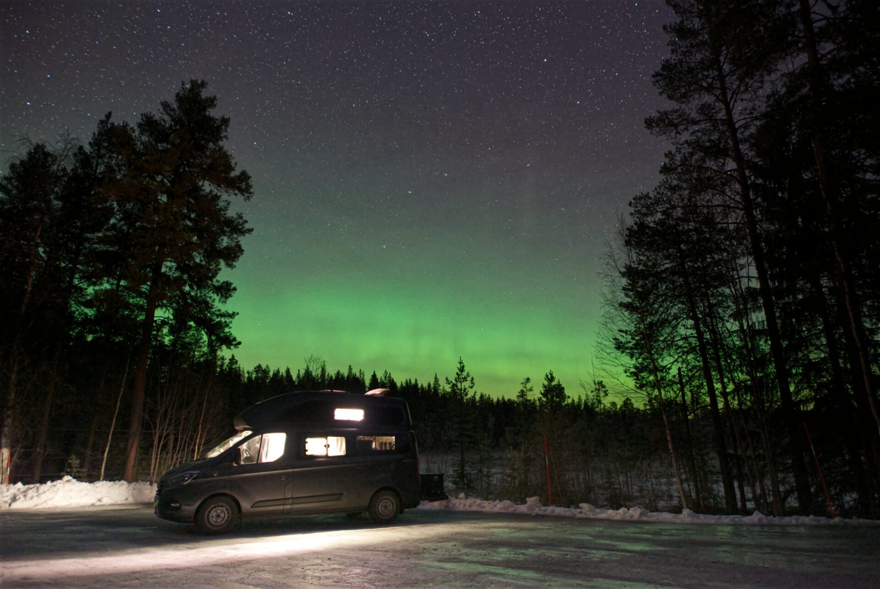 Die Suche nach einem Stellplatz für die Nacht hat sich danach schwierig gestaltet. Viele Wege und Zufahrten waren für uns nicht befahrbar, da sie nicht vom Schnee geräumt worden waren. Glück hatten wir dann jedoch mit einem Rastplatz, der an der E45 auftauchte. Dieser sollte sich nicht nur als guter Stellplatz erweisen, sondern auch als tolle Location für das Aufnehmen von Polarlichtern – endlich! 🤩