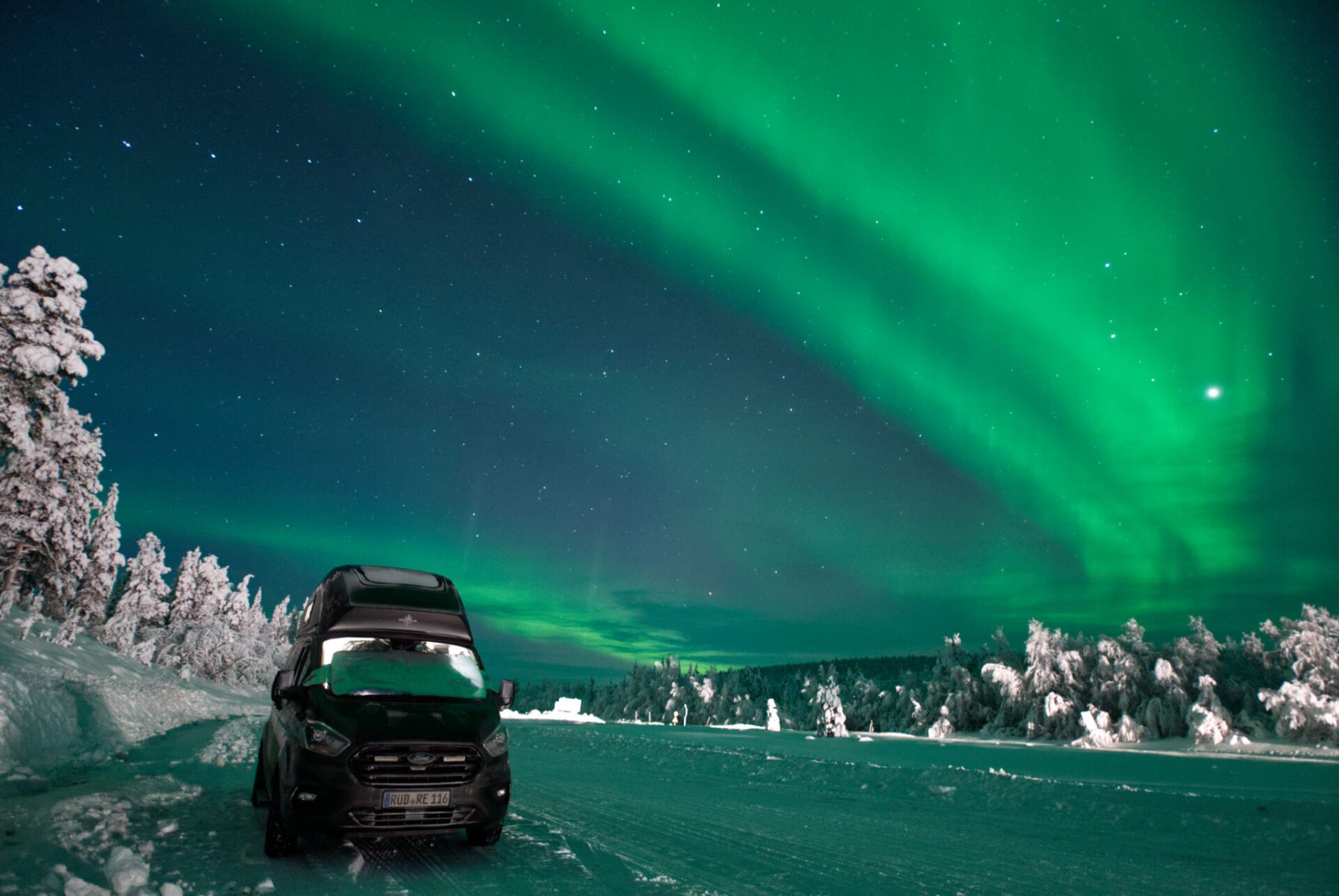 Die Suche nach einem Stellplatz für die Nacht hat sich danach schwierig gestaltet. Viele Wege und Zufahrten waren für uns nicht befahrbar, da sie nicht vom Schnee geräumt worden waren. Glück hatten wir dann jedoch mit einem Rastplatz, der an der E45 auftauchte. Dieser sollte sich nicht nur als guter Stellplatz erweisen, sondern auch als tolle Location für das Aufnehmen von Polarlichtern – endlich! 🤩