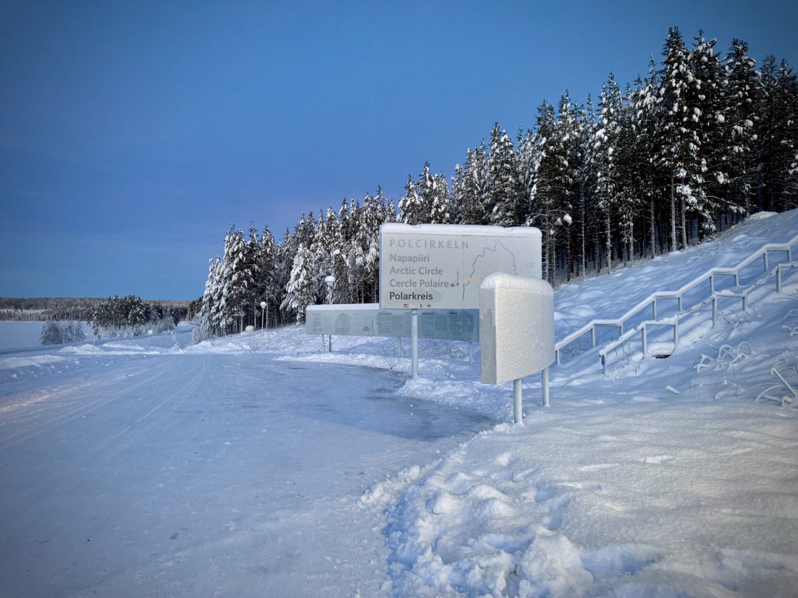 Ebenfalls Glück hatten wir, den Parkplatz am Polarkreis rechtzeitig zu erkennen. Er liegt relativ unscheinbar an der Straße und ist in der Winterlandschaft leicht zu übersehen.